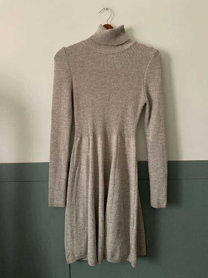 Gri renkli, yüksek yakalı ve uzun kollu, yumuşak yün kumaştan yapılmış triko elbise. Diz boyunda, sade ve desen içermeyen tasarıma sahiptir.