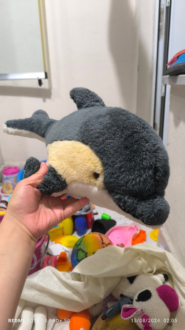 Yumuşak dokulu gri yunus peluş oyuncak, gerçek yunus şeklini andıran detaylarla rahatlık sağlar.