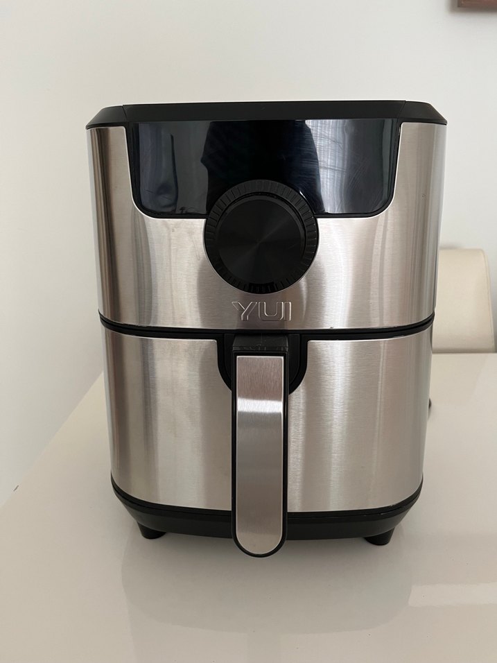 Gri renkli Yuı airfryer, paslanmaz çelik gövde, ön kontrol düğmesi ve kolay kullanım için tutacak içerir. Kompakt tasarımı ile ızgara ve fritöz işlevi sunar.