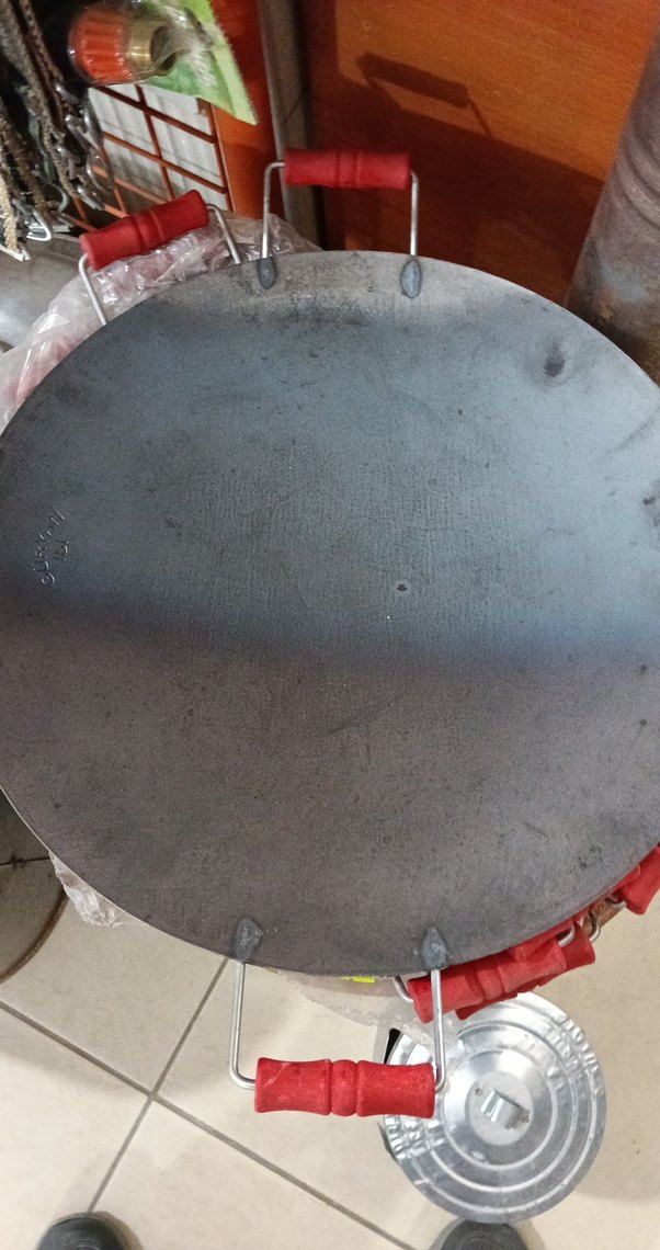 Kırmızı saplı metal kulplara sahip, düz pişirme yüzeyli yuvarlak gri tava.