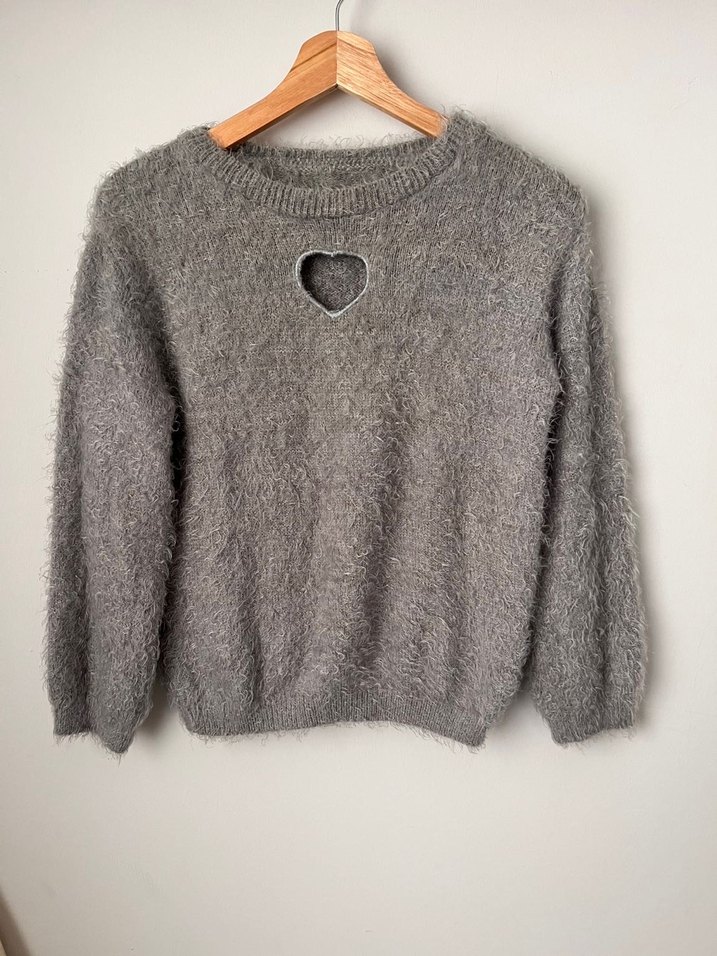 Gri renkte, kalp şeklinde kesim detaya sahip yuvarlak yakalı ve uzun kollu, bol kesim triko kazak.
