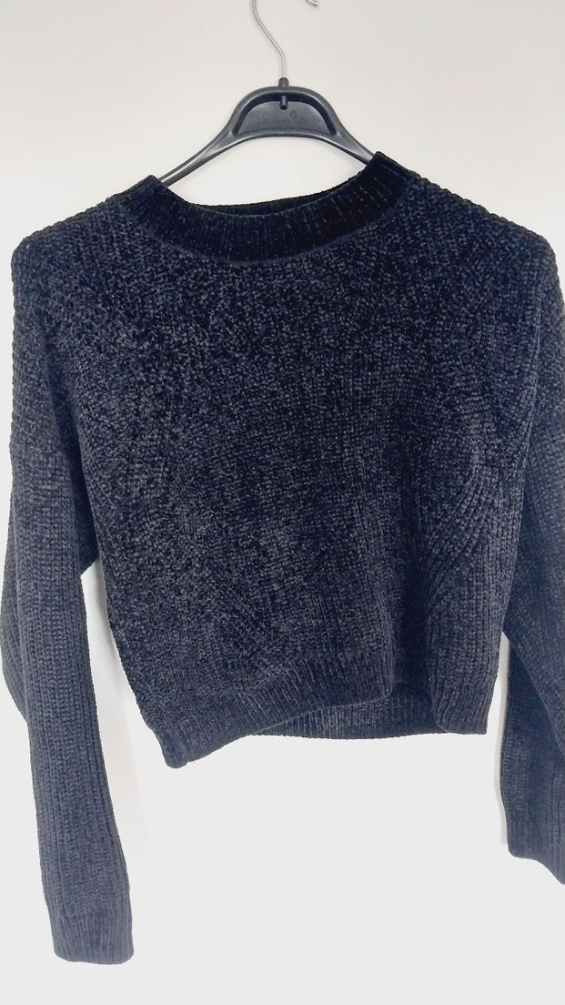 Gri renkli, yuvarlak yaka ve uzun kollu örgü kadın kazak, rahat kesimi ve kısa boyuyla günlük kullanıma uygundur.