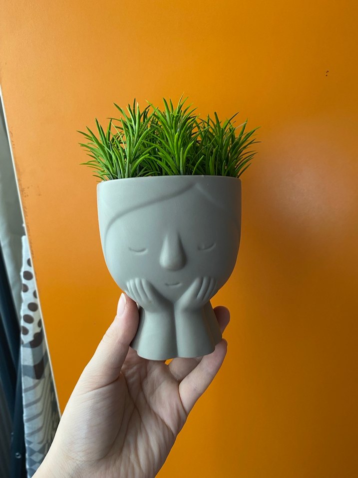Ellerini yanağında dinlendiren huzurlu yüz figürlü gri saksı, küçük yeşil bitkiyle birlikte.