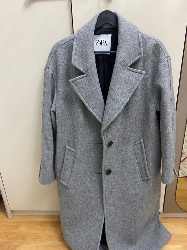 Yumuşak yün karışımlı kumaştan, geniş yakalı ve düğmeli, iki cepli gri Zara kaban.