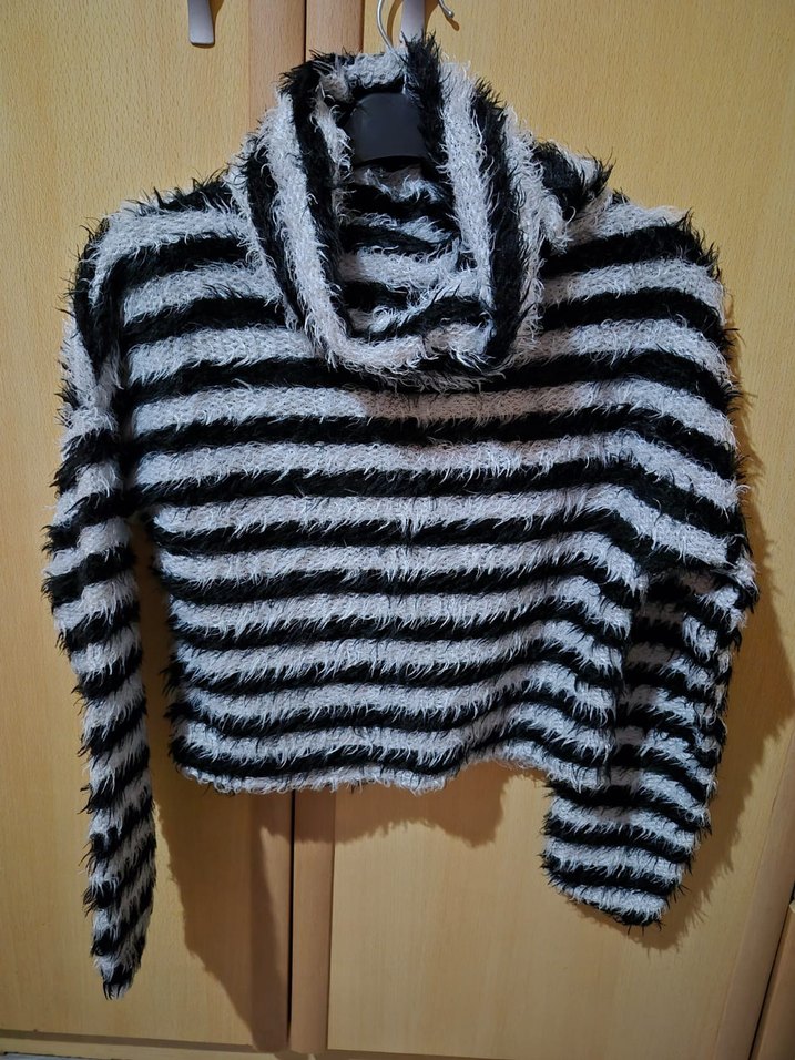 Gri zebra desenli, kısa kesim, uzun kollu ve boğazlı örme kadın kazak. Yumuşak sentetik kumaştan, rahat ve şık günlük kullanım için uygun.