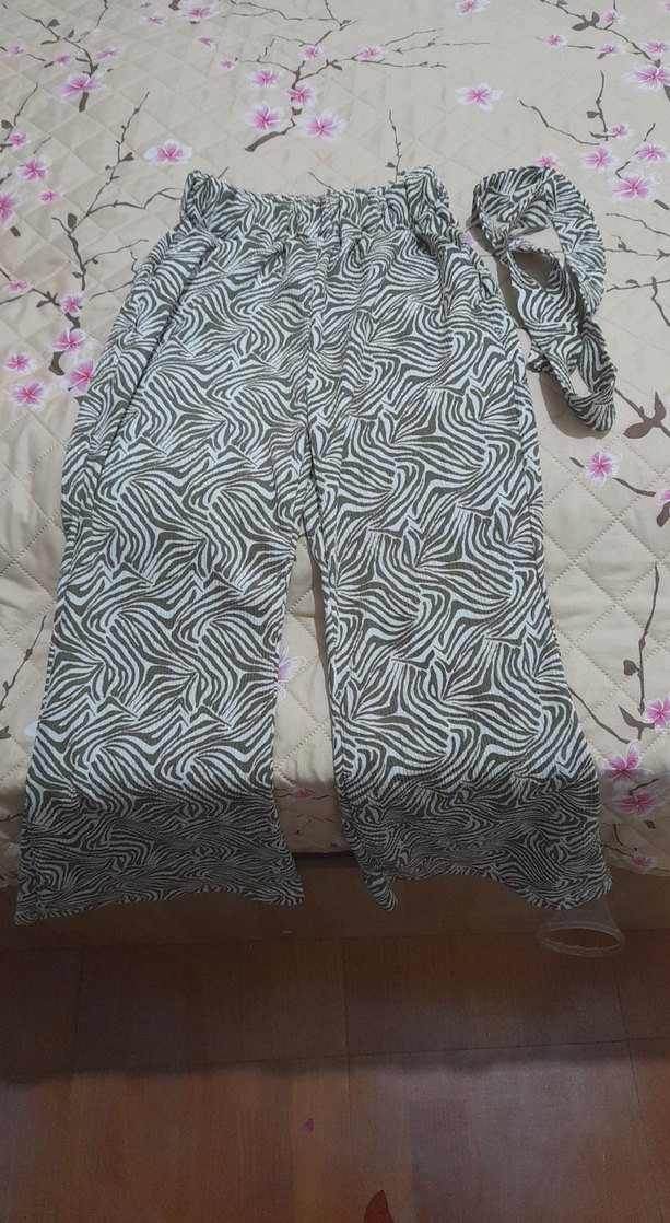 Yumuşak sentetik kumaştan, gri zebra desenli uzun, bol kesim ispanyol paça pantolon. Trend sokak stili için kemerli tasarım içerir. sadece 1 kere giyildi