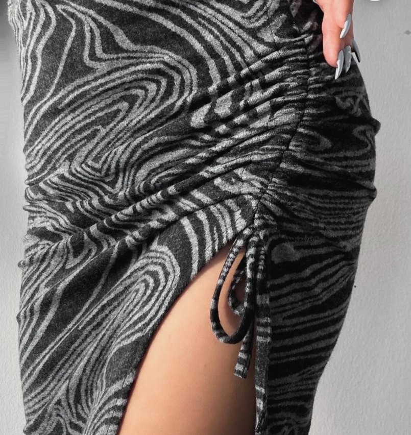 Gri zebra desenli, drapeli ve uzun kesim hamile eteği, yumuşak sentetik kumaştan üretilmiştir. Gotik tarzıyla açık hava kullanımı için uygundur.S M L