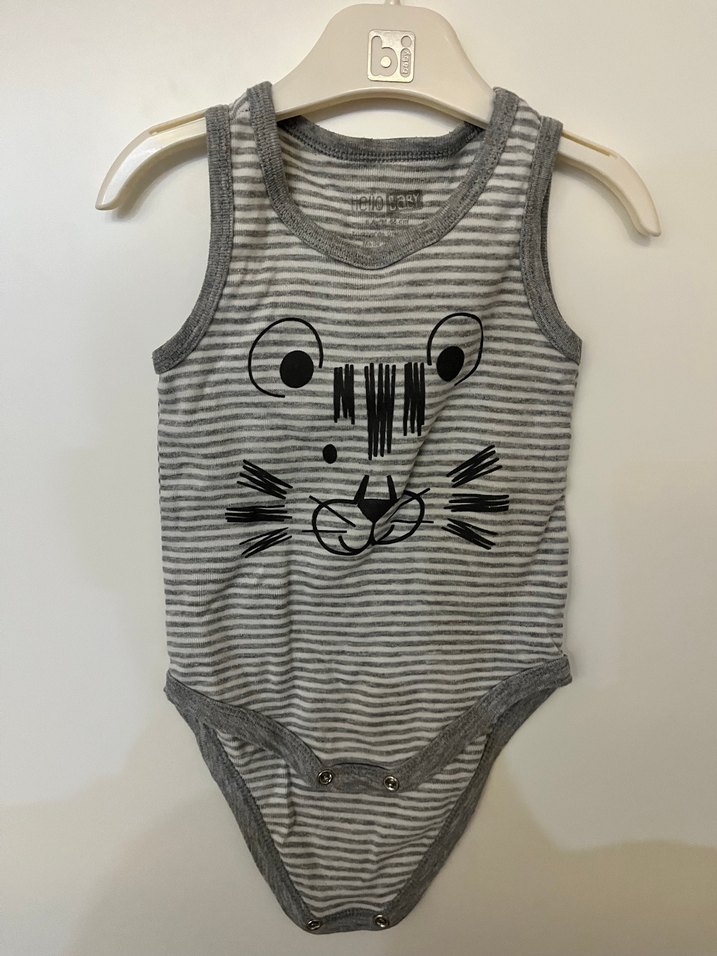 Gri zebra desenli, kolsuz erkek bebek body. Örgü görünümlü sentetik kumaştan, yuvarlak yaka ve çıtçıtlı kapanışlıdır.