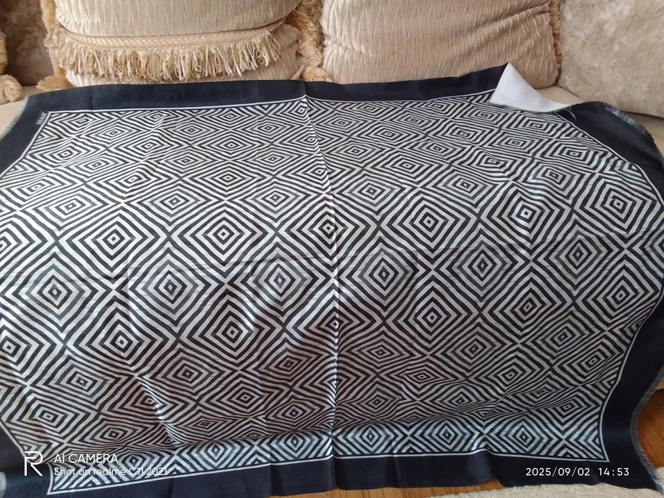 Koyu gri zeminde zebra desenli, gemetrik esarp