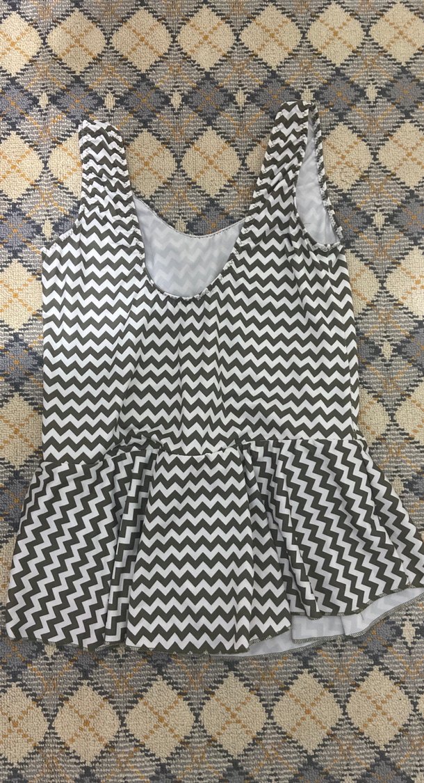 Gri zebra desenli, kolsuz ve kısa mayo. Fırfırlı detayları ve tekne yaka tasarımı ile bohem vintage tarzına uygundur.