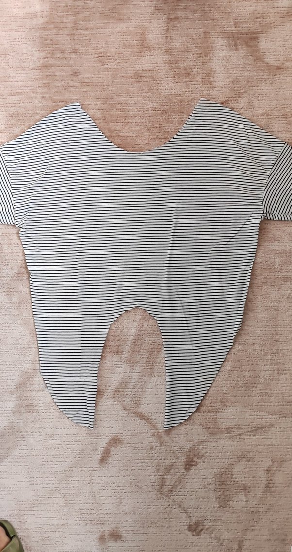 Gri zebra desenli, kısa kollu, kayık yaka hamile tişörtü. Normal midi boyda, bol kesim ve sade minimal tarzda, günlük kullanıma uygun.