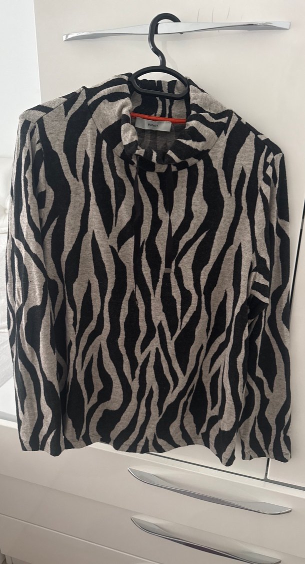 Gri zebra desenli, uzun kollu ve yüksek yakalı kadın bluz. Bol kesim ve normal boyda, triko rahat ve modern tarzda günlük kullanım için uygun.