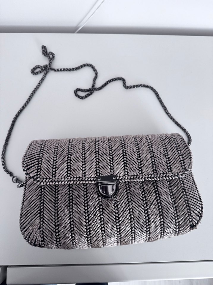 Gri zebra desenli, kemerli kadın çantası. Sentetik kumaştan olup zincir askıya sahiptir. Günlük kullanıma uygundur.
