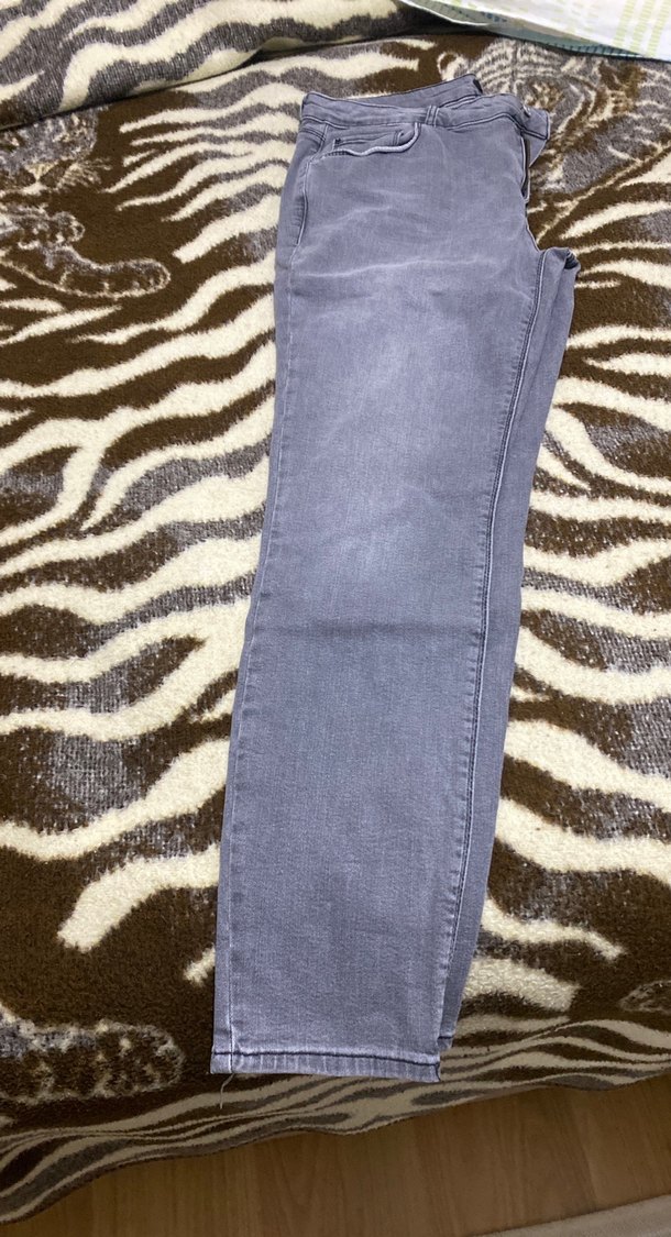 Gri renkli denimden yapılmış, zebra desenli ve normal boy midi uzunluğunda kadın pantolon, rahat ve şık bir görünüm sunar.