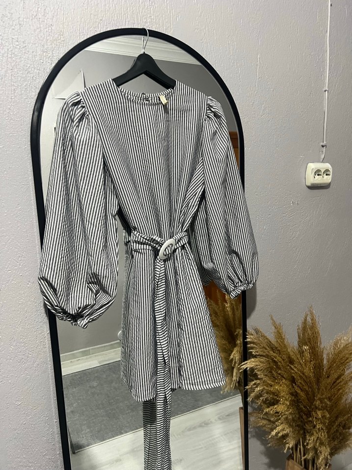Gri keten kumaştan, zebra desenli, uzun kollu, kemerli ve bol kesim hamile bluzu. Ofis için şık ve rahat bir tercih.