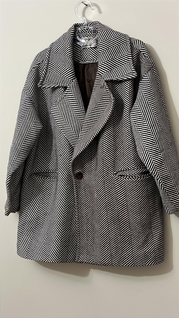 Kadın kaban, gri zebra desenli, düğmeli, notched lapel yakalı, normal uzunlukta ve uzun kolludur. Günlük kullanım için uygundur. Bir cebinde sıkıntı var onun dışında sorunu yoktur.standart bedendir.