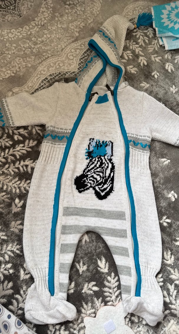 Gri renkte, örgü kumaştan yapılmış, önünde zebra deseni ve kapüşonu bulunan sıcak tutan bebek tulumu.