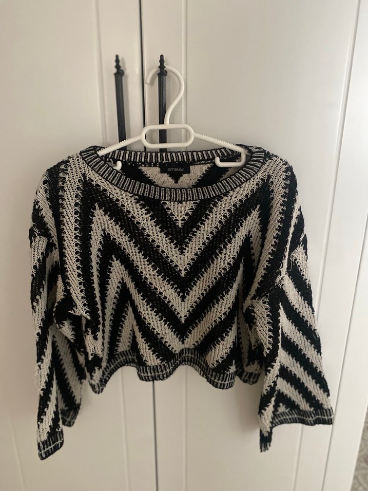 Gri renkli, zebra desenli örgü kadın kazak. Bol kesim, uzun kollu ve tekne yaka modeldir. Midi boyda, rahat ve bohem tarzda bir parça.