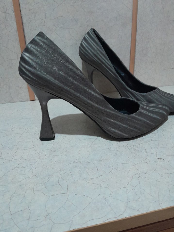 Gri zebra desenli, pileli ve kauçuk tabanlı stiletto topuklu ayakkabı, modern ofis şıklığı için uygun.