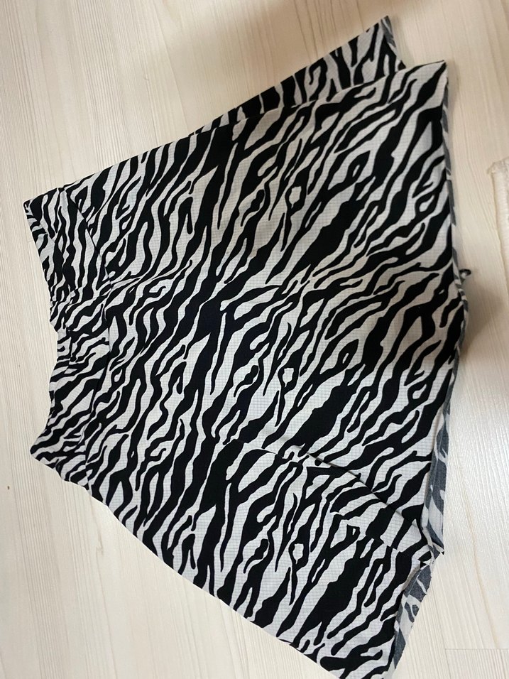 Gri sentetik kumaştan, pilili ve bol kesim zebra desenli hamile şortu, günlük sokak modasına uygun minimal tarzda.