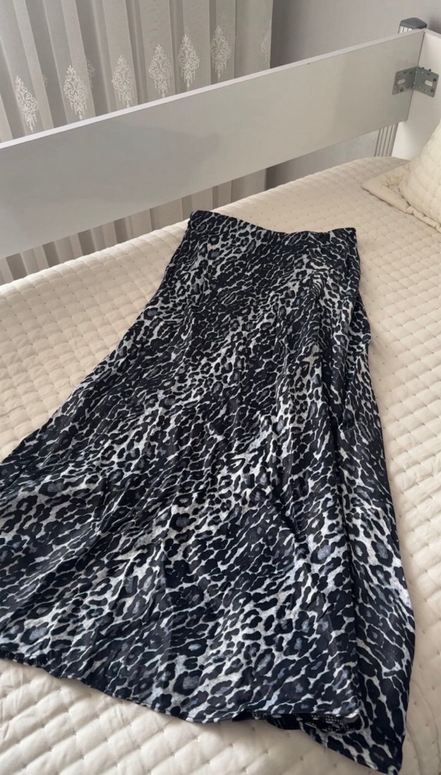 Gri zebra desenli, pilili ve bol kesim uzun etek, yumuşak sentetik kumaştan üretilmiştir. Bohem tarzıyla dış mekanlar için uygundur.