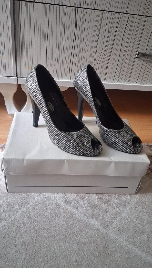 Gri zebra desenli, pliseli ve kauçuk malzemeden üretilmiş kadın topuklu ayakkabılar. Ofis için klasik ve çağdaş tarzda uygundur. 1 kez giyildi sıfır ayarında