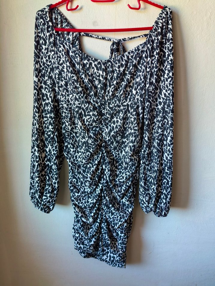 Gri zebra desenli, sırt detaylı ve uzun kollu elbise. Midi boyda ve sentetik kumaştan. Hiç giyilmesi. Trendyol