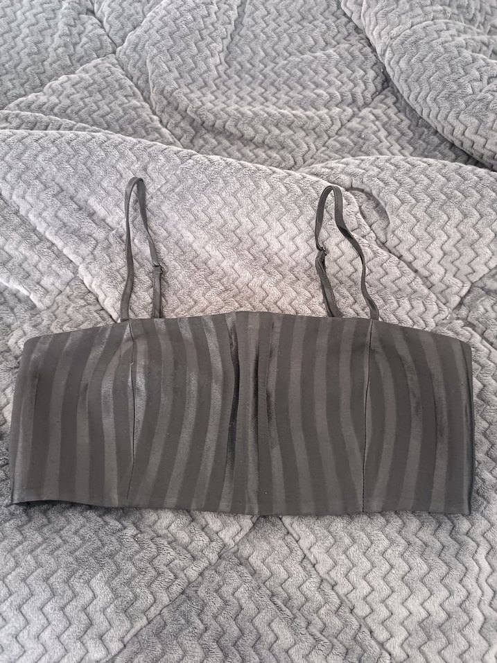 Gri zebra desenli, pileli detaylara sahip dar kesim bustiyer. İnce askılı ve kısa boylu, şık bir görünüme sahiptir. Pürüzsüz sentetik kumaştan üretilmiştir.