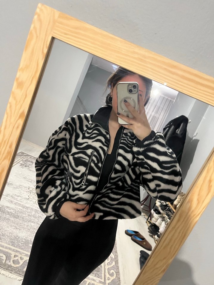 Gri zebra desenli, suni kürk detaylı kadın ceket. Yüksek yakalı, uzun kollu ve midi boyda, rahat kesim ve yumuşak kumaştan üretilmiştir.