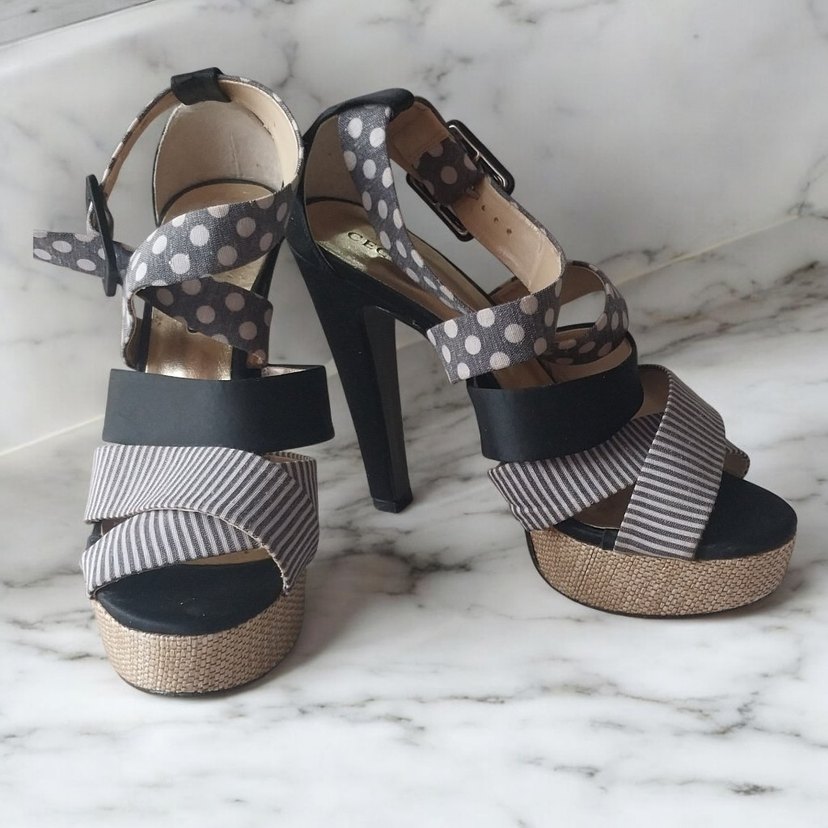 Gri zebra desenli, tokalı kayışlara sahip platform topuklu kadın ayakkabısı. Kauçuk tabanlı, çağdaş ve Paris esintili tasarım, günlük kullanıma uygun.
