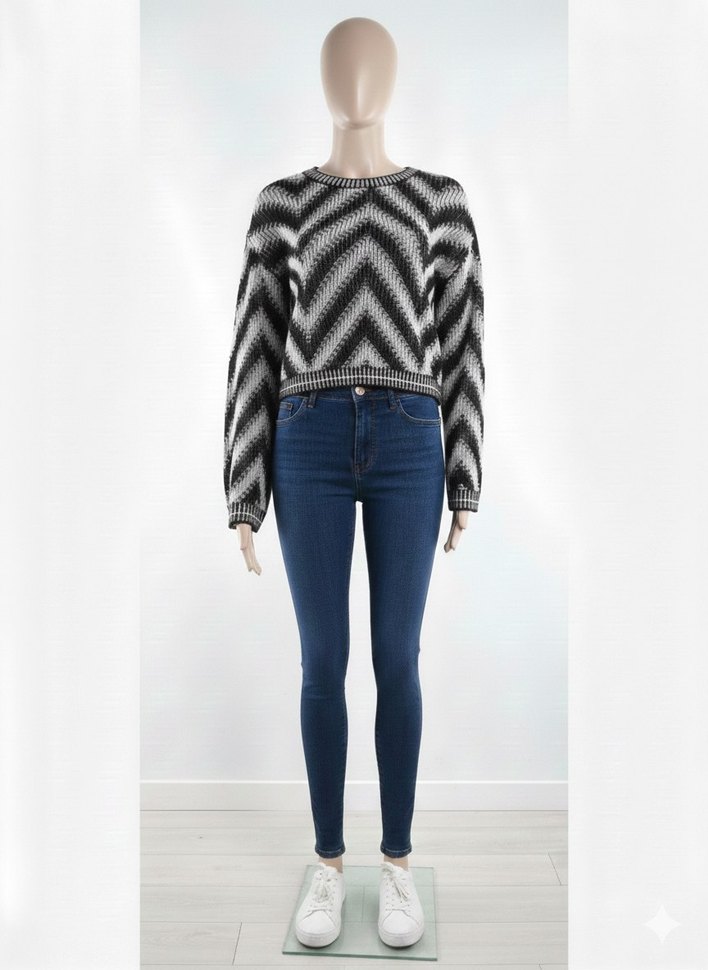 Gri zebra desenli, triko dokulu, yuvarlak yakalı ve uzun kollu kadın kazak. Rahat kesim ve midi boyda, günlük kullanıma uygun.