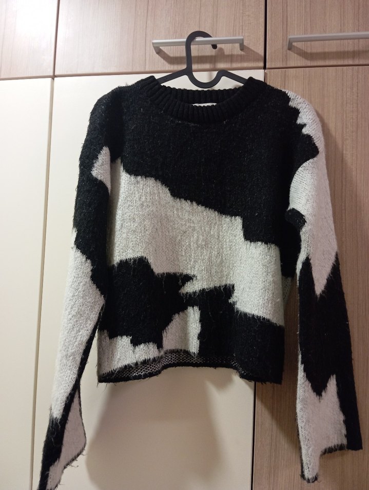Gri tonlarda zebra desenli, uzun kollu, yuvarlak yakalı, bol kesim triko kadın kazak. Günlük ve sokak stiline uygundur.
