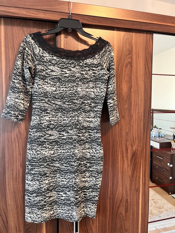 Gri zebra desenli, triko kumaştan yapılmış, uzun kollu ve tekne yakalı dantel detaylı oturan midi elbise. Günlük kullanıma uygun modern tarzda.