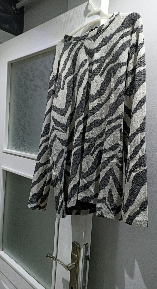 Gri zebra desenli, uzun ve bol kesim hamile kazağı. Uzun kollu ve boğazlı, yumuşak sentetik kumaştan günlük kullanım için uygundur.