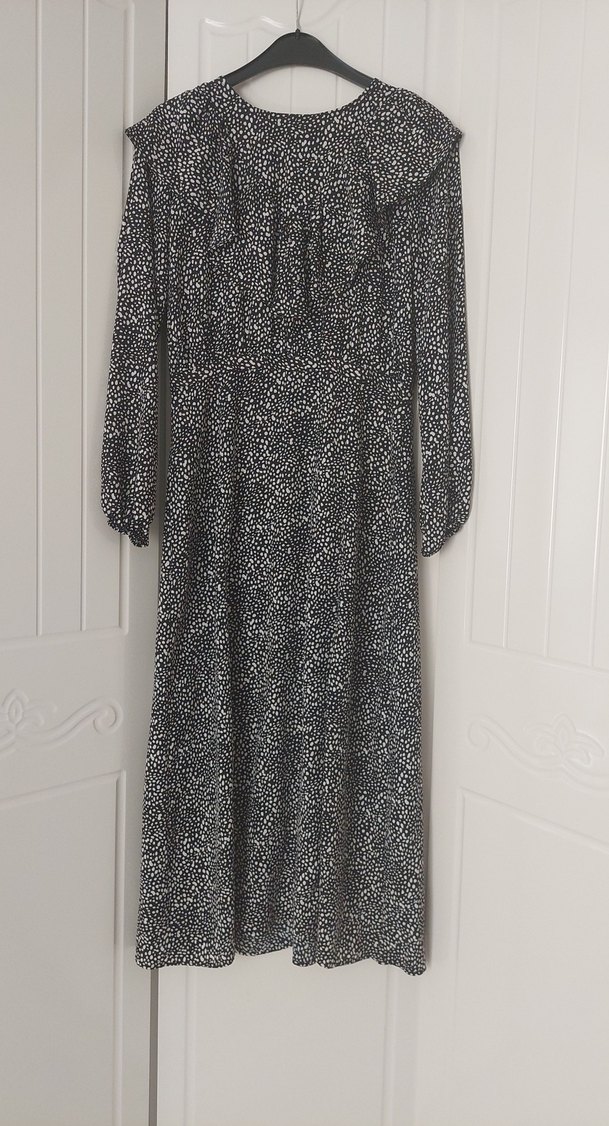 Gri zebra desenli, uzun kollu ve salaş kesim kadın elbisesi. Yumuşak sentetik kumaştan, salaş ve fırfırlı detaylara sahip, günlük kullanıma uygun bir modeldir.