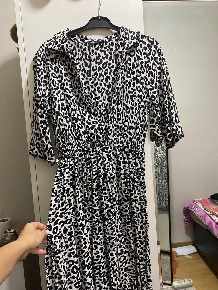 Gri zebra desenli, kısa kollu ve bol kesim uzun kadın elbisesi, Paris sokak modasını yansıtıyor. Hiç giyilmedi m beden