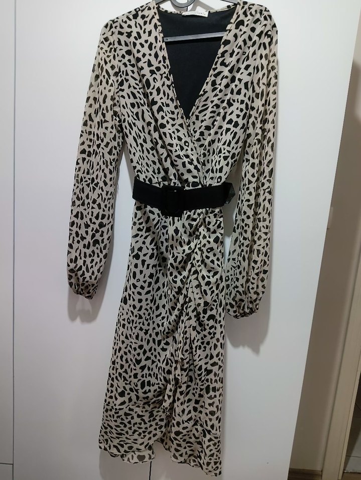 Gri zebra desenli, V yakalı ve uzun kollu, kemerli uzun elbise. Yumuşak sentetik kumaştan, çağdaş moda tutkunları için ideal.