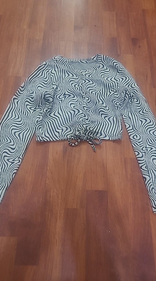 Gri zebra desenli, uzun kollu ve tekne yaka kesime sahip dar kesim kadın bluz. Etek kısmında büzgü ve fırfır detayı bulunur.