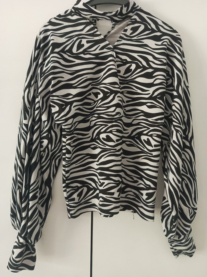 Gri zebra desenli, yüksek yakalı, pileli detaylı uzun kollu bol kesim bluz. Yumuşak sentetik kumaştan, günlük kullanım için uygundur.