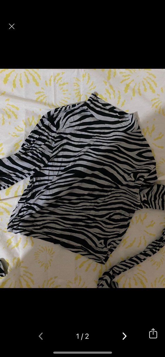 Gri zebra desenli, uzun kollu ve boğazlı, pileli sentetik kumaştan yapılmış, dar kesim sokak stili bluz. Günlük kullanıma uygun.