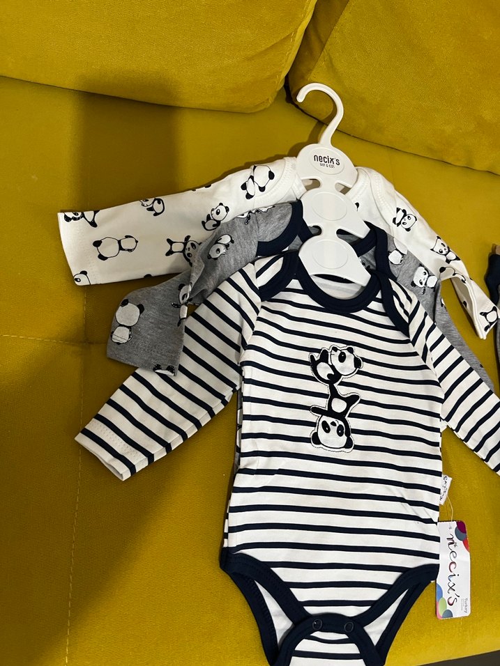 Gri renkte, düğmeli, yakalı ve uzun kollu pamuklu erkek bebek body. Zebra desenli ve rahat kullanım sağlar. Marka: ecix's. 3lü