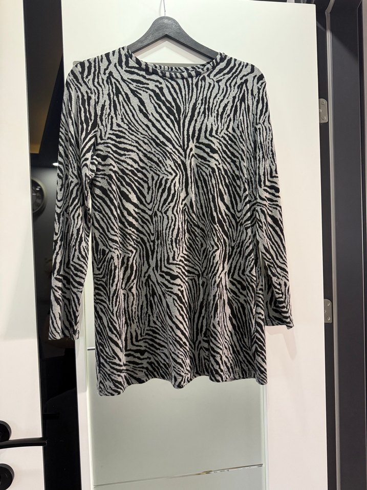 Gri zebra desenli, uzun kollu, salaş kesim ve tekne yaka kadın tunik. Yumuşak sentetik kumaştan, ince triko günlük kullanım için uygundur.