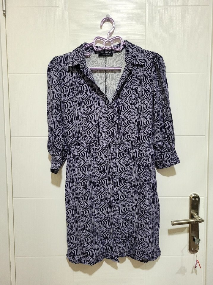Gri renkte, zebra desenli midi gömlek elbise. Uzun kollu, yakalı, düğmeli ve bol kesimdir. Yumuşak pakuklu kumaştan, günlük rahat sokak stiline uygundur.