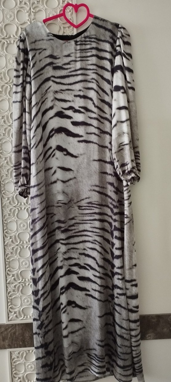 Gri zebra desenli uzun elbise, drapeli tasarıma sahiptir. Uzun kollu, kayık yaka ve salaş kesimdir. Sentetik kumaştan yapılmıştır. Bohem stil için uygundur.