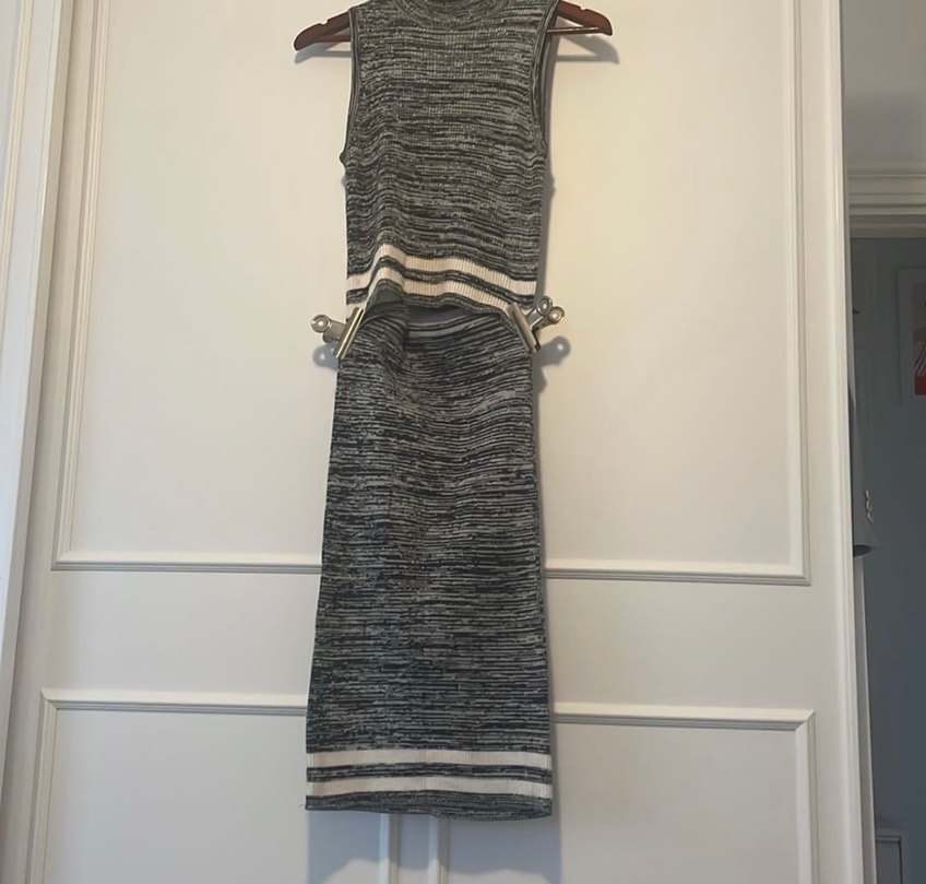 Yüksek yakalı, askılı uzun gri triko elbise. Bel detaylı, vücuda oturan kesimi ile günlük kullanıma uygun. S- M uyumludur 166 boy 57 kilo ile kullandım