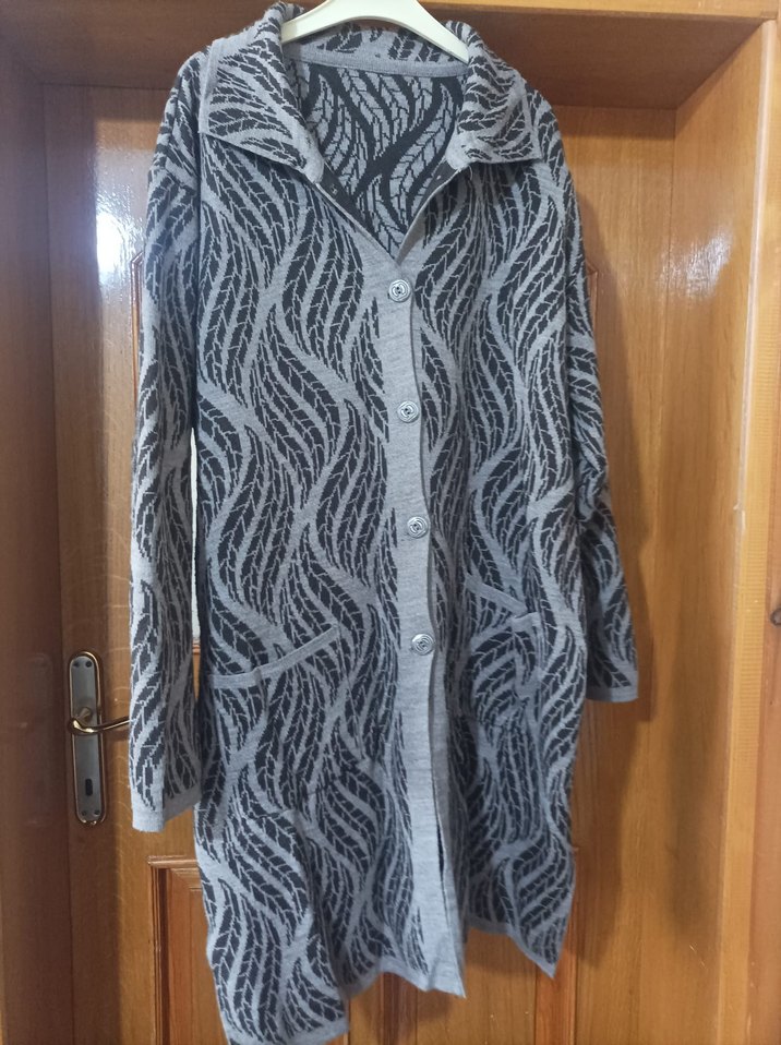 Gri zebra desenli, uzun triko hamile hırkasıdır. Notlu yakalı ve uzun kolludur. Rahat, bol kesimdir, şık ve gündelik kullanıma uygundur.