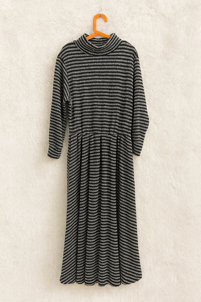 Gri Zebra Desenli Uzun Yün Elbise