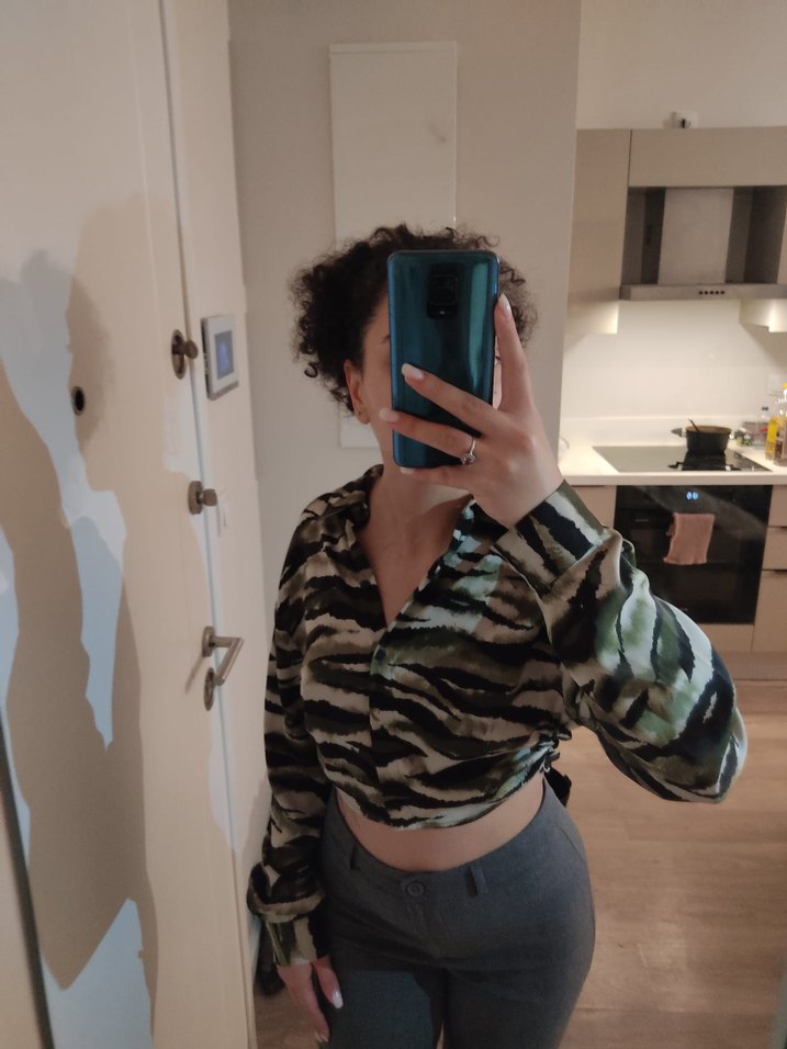 Yeşil zebra desenli, uzun kollu, V yaka kadın gömlek, rahat kesimiyle günlük kullanım için uygundur. profilim de alt mevcut. Toplu alımlarda indirim yaparım