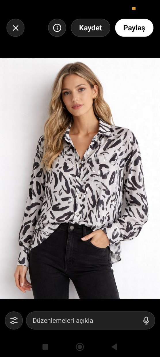 Gri zebra desenli, uzun kollu, V yaka ve düğmeli kadın gömleği. Rahat kesimi ve yumuşak sentetik kumaşıyla günlük kullanıma uygundur.