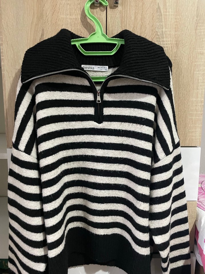 Yarım fermuarlı yüksek yakalı, uzun kollu, gri ve siyah zebra desenli, yumuşak ve sıcak dokulu, bol kesim kadın triko kazak.